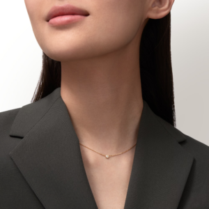 Crafted in polished 18K gold, the mini model rests lightly on the neckline, glowing with a soft, intimate brilliance that feels both effortless and luxurious. Its minimalist round silhouette captures the essence of love in its purest form—quiet, constant, and beautifully understated.