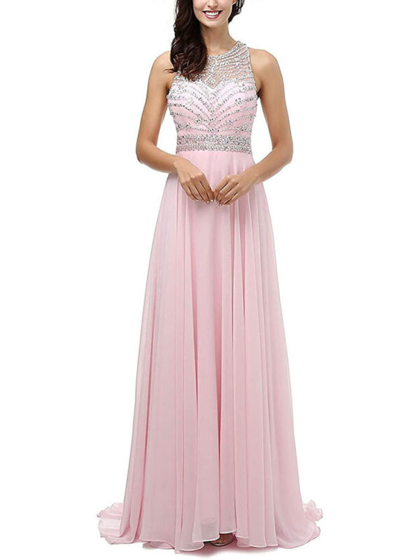 - Chiffon, Crew Neck, Sleeveless, Floor-Length, Beading, A-Line, Criss-Cross Zipper back design
