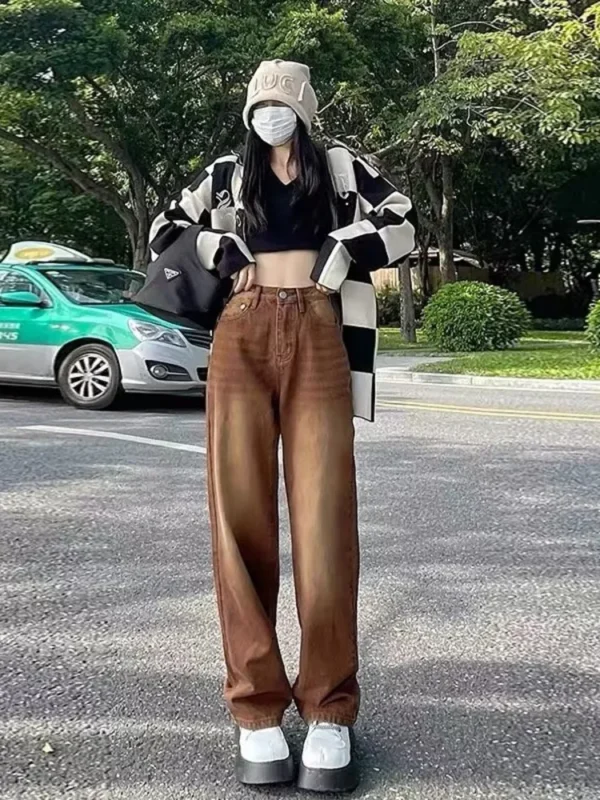 Feynzz European And American Retro Brown Jeans Women’s Spring And Autumn High-waisted Straight-leg Loose And Thin Wide-leg Pants