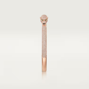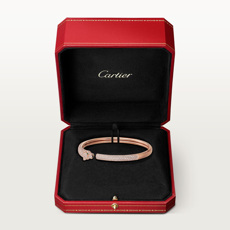 The Panthère de Cartier bracelet draws inspiration from Cartier’s legendary panther motif, symbolizing strength, elegance, and independence. The small model offers a more delicate interpretation, enhanced with pavé-set stones that add subtle brilliance while preserving the fluid silhouette.