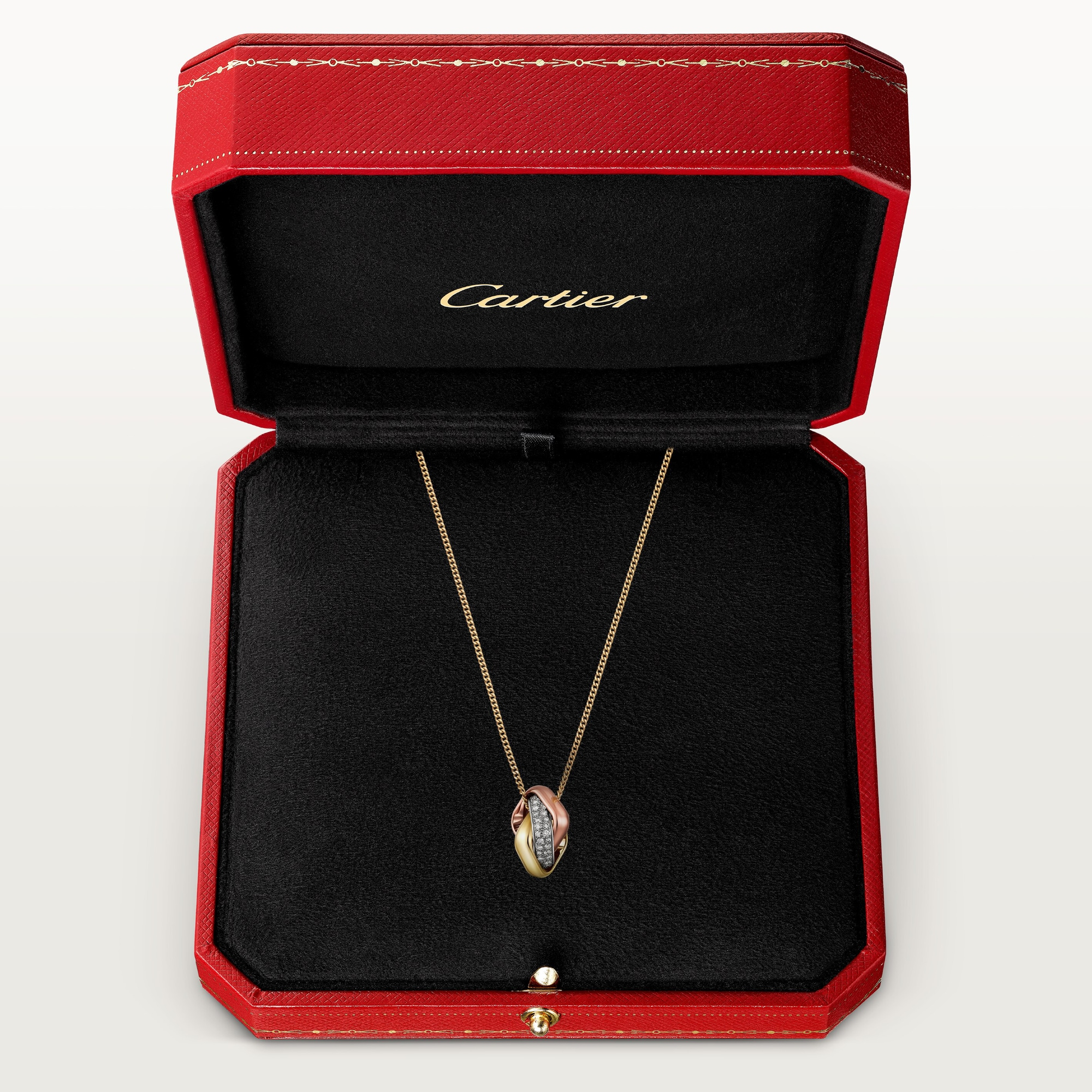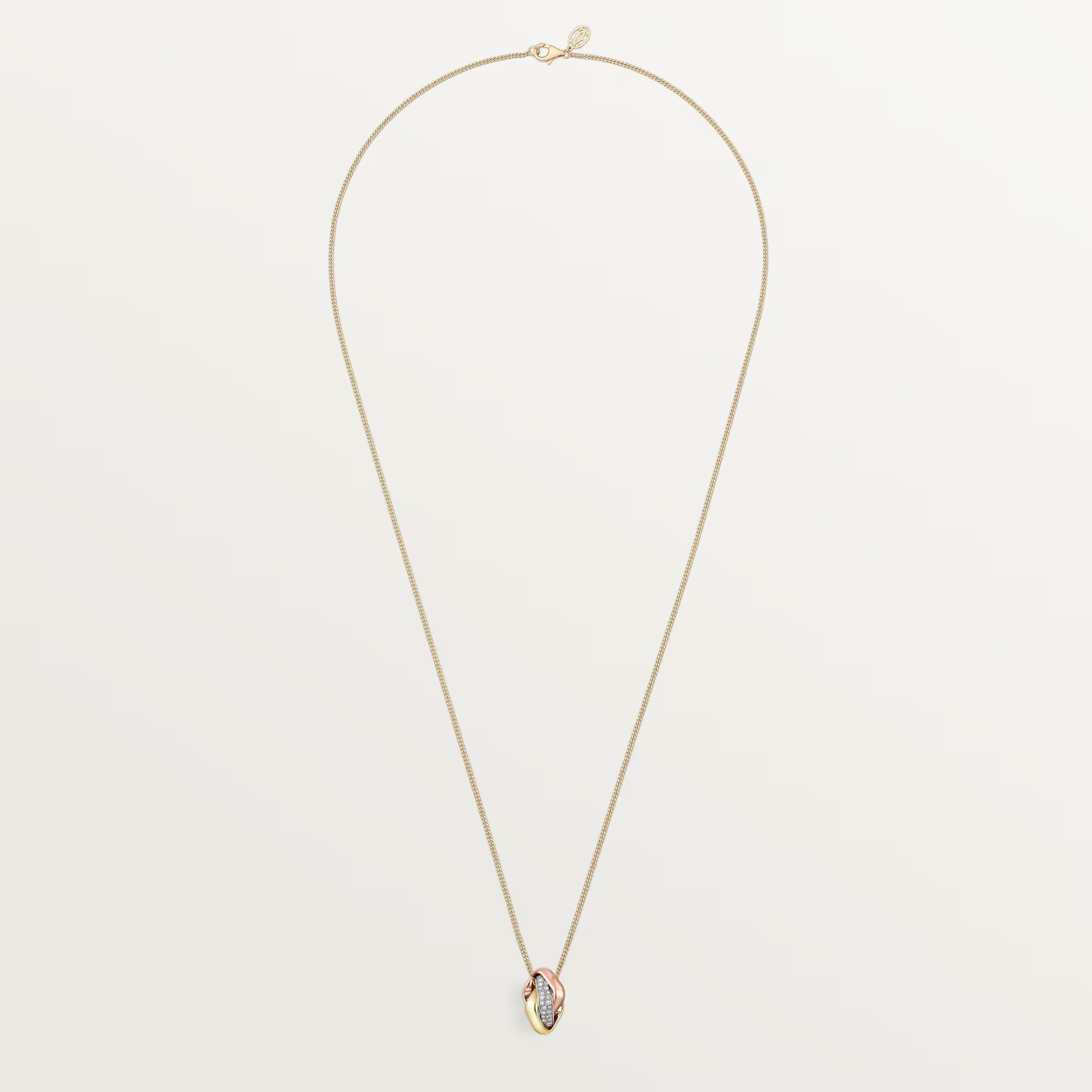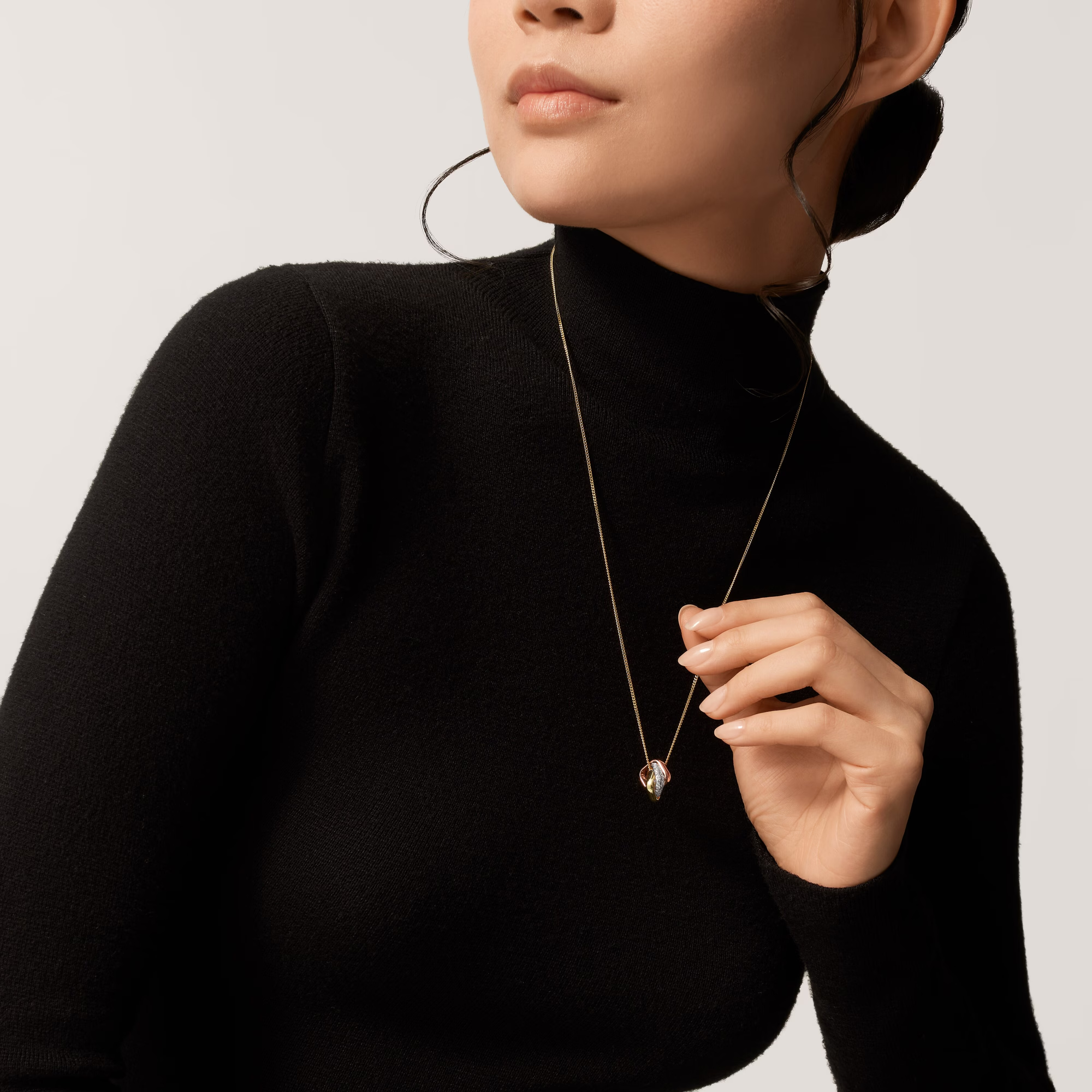The legendary Cartier Trinity is reinterpreted in a sculptural cushion-shaped pendant, blending soft curves with architectural elegance. Crafted from the signature trio of 18K yellow, white, and rose gold, the piece symbolizes unity, harmony, and enduring connection.