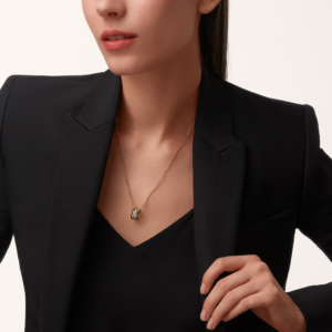 One side of the pendant is adorned with half-pavé brilliant-cut diamonds, adding a refined sparkle that enhances the design’s gentle geometry. The partial pavé creates a striking balance — luminous yet understated, modern yet deeply timeless.