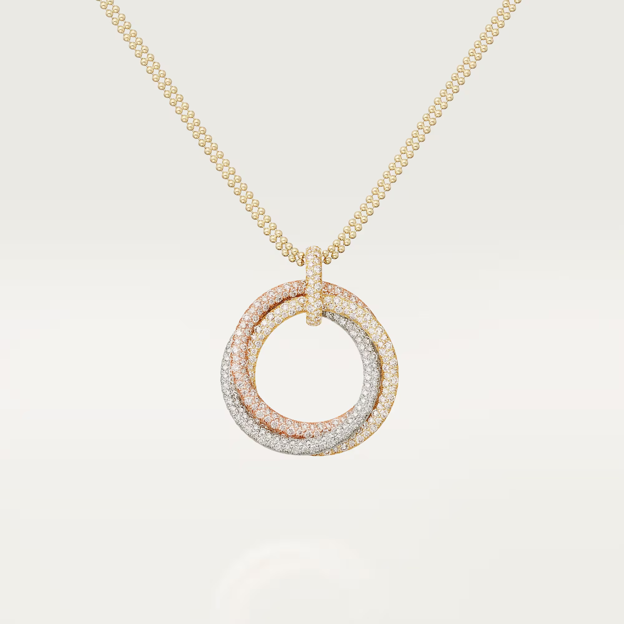 Majestic, sculptural, and breathtakingly luminous—the Trinity pendant in its large pavé model reimagines Cartier’s iconic trio with a brilliant symphony of diamonds. Three interlaced bands of 18K white, yellow, and rose gold are fully illuminated with meticulously set pavé diamonds, creating a dazzling constellation of light in motion.