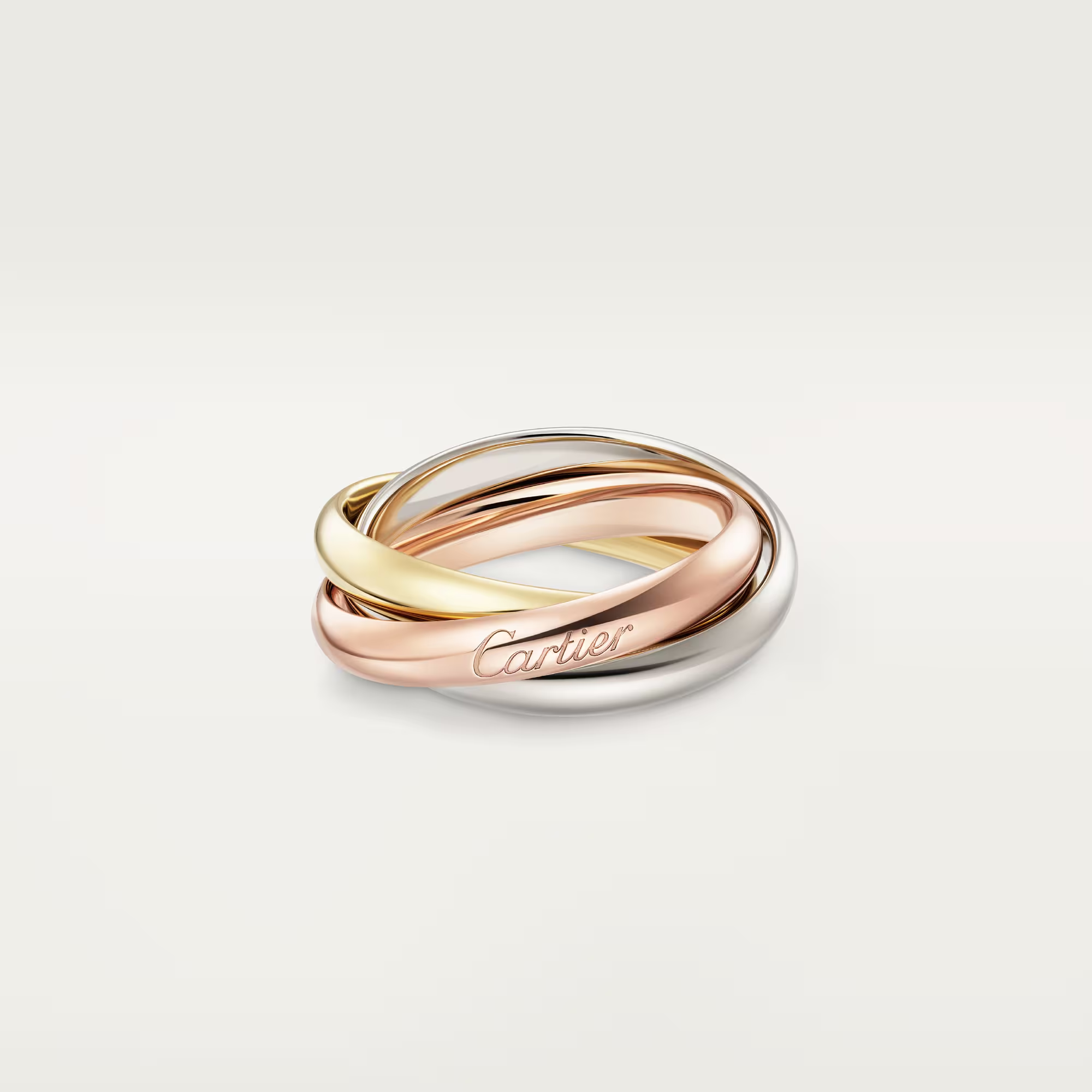 The Cartier Trinity Ring, crafted in the iconic tri-color 18K gold, is a masterpiece of elegance and symbolism. Each of the three intertwined bands—yellow, white, and rose gold—represents love, fidelity, and friendship, creating a timeless emblem of enduring bonds.