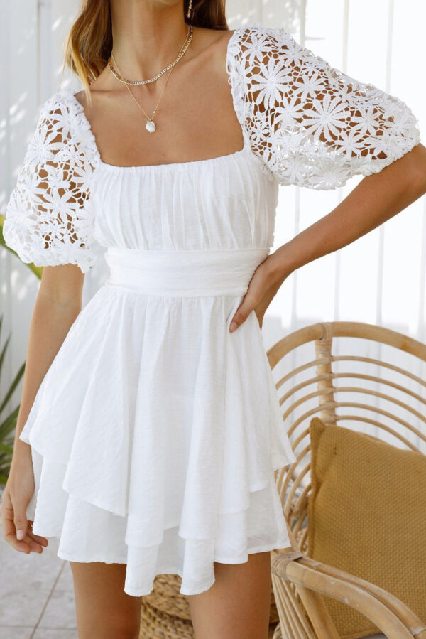 - It features a ruched bust with a square neckline, breezy bouffant sleeves, a snatched waistline, and a flared skirt with ruffle trimming