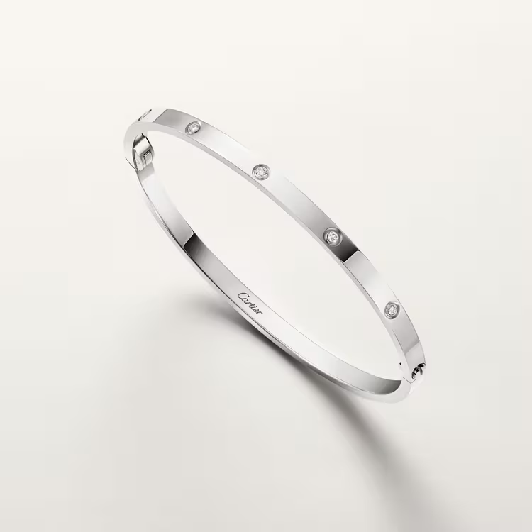The Cartier LOVE bracelet, small model, presents a delicate interpretation of the Maison’s iconic symbol of eternal love. Featuring the signature screw motif, the design is enhanced with 10 diamonds that add elegant sparkle while maintaining its sleek, minimalist character.• Diamonds