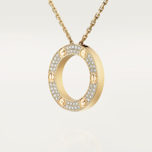 Set in warm 18K yellow gold, the pendant’s circular frame is entirely paved with diamonds, creating a continuous surface of light that enhances the graphic clarity of the LOVE codes. The signature screws—crisp, symmetrical, engraved with precision—anchor the design, balancing sparkle with structure.