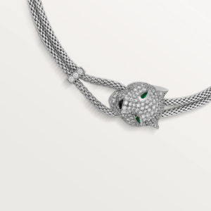 Bold, enigmatic, and instantly recognizable—the Panthère de Cartier paved necklace captures the untamed spirit of Cartier’s most legendary emblem. Every curve of the panther’s silhouette is meticulously sculpted and illuminated with brilliant-cut diamonds, creating a hypnotic sparkle that commands attention from every angle.