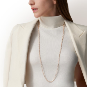 Bold, architectural, and undeniably modern, the Santos de Cartier long necklace draws its strength from one of the Maison’s most iconic creations. Echoing the screws of the legendary Santos watch, this chain interprets Cartier’s design codes through clean geometry, precise proportions, and an unmistakable spirit of freedom.