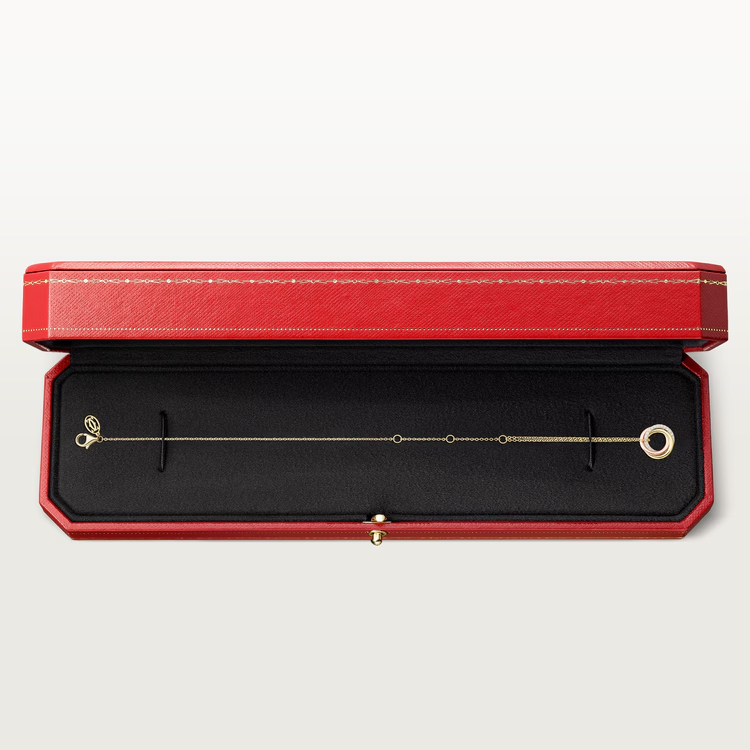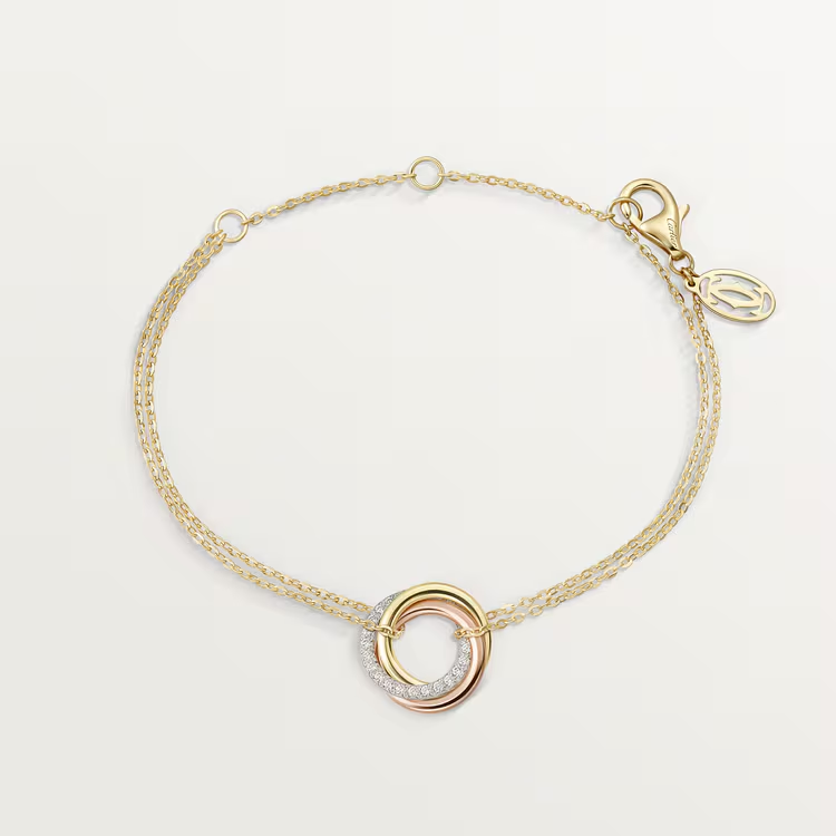 The Trinity bracelet is defined by Cartier’s iconic three interlocking rings, representing love, fidelity, and friendship. Reimagined on a delicate chain and enhanced with diamonds, the design offers a modern and graceful interpretation of this timeless symbol.• Diamonds
