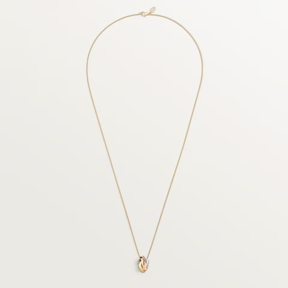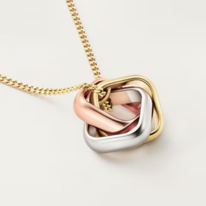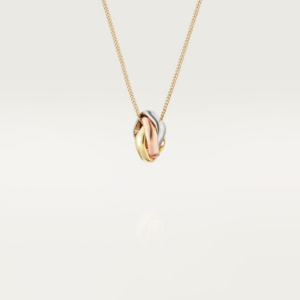 Graceful, intimate, and beautifully timeless—the cushion-shaped Trinity pendant reinterprets Cartier’s iconic trio with soft geometry and irresistible fluidity. Three interlaced bands in 18K white, yellow, and rose gold come together in a sculptural cushion form, symbolizing love, fidelity, and friendship in perfect balance.