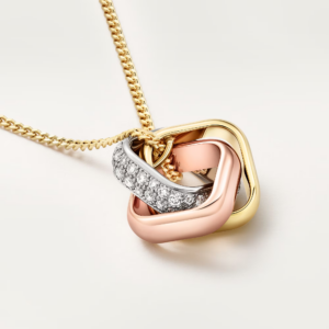 The legendary Cartier Trinity is reinterpreted in a sculptural cushion-shaped pendant, blending soft curves with architectural elegance. Crafted from the signature trio of 18K yellow, white, and rose gold, the piece symbolizes unity, harmony, and enduring connection.